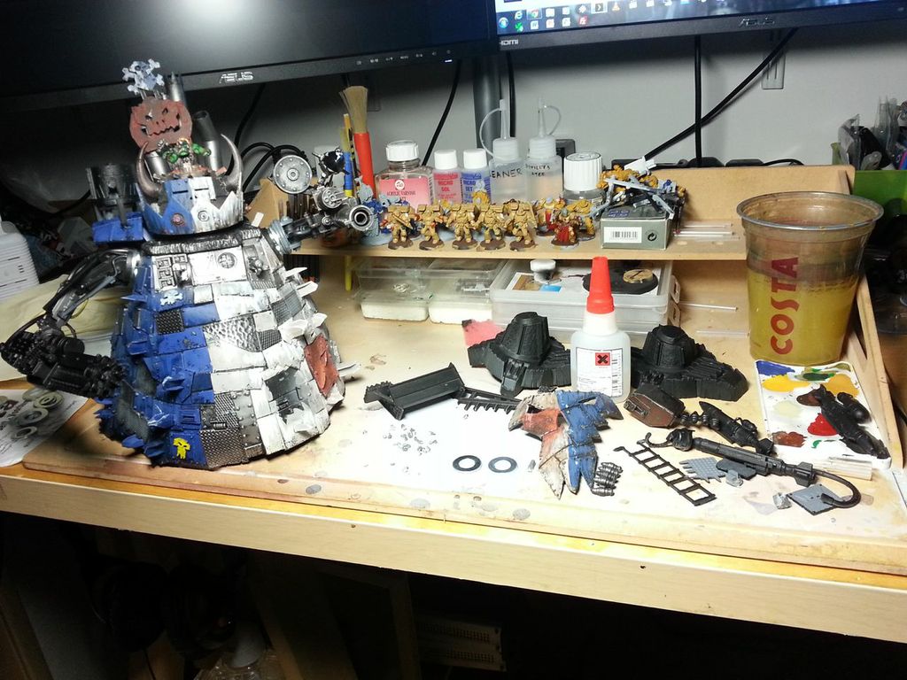 As it is, I’m planning to finish the glueing before I spray the whole thing black and paint it up again. I’m thinking a Deff Skullz theme of blue and maybe some red and silver in places, to try and get a general scavenged and broken-looking model. My airbrush will definitely be useful here for large areas.