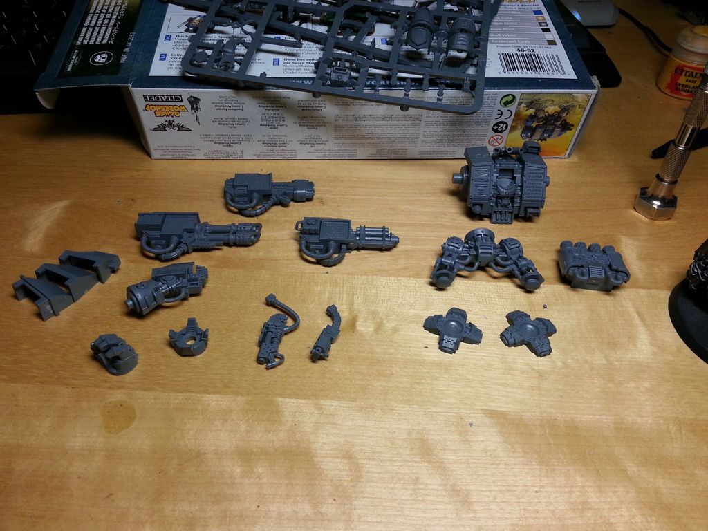 I’ve since begun with painting, using my airbrush to get a nice even coat across both models and beginning with base detailing. So far its just Dark Metal and some Leadbelcher to pick up the metal bits before doing the other base colours. Other bits to pick out will be the purity seals, scrolls, skulls and lenses. Read the rest of this entry »